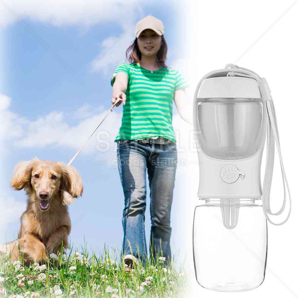 ペット用ウォーターボトル 水筒 持ち歩き 散歩 ドッグラン ドライブ 給水器付き 水飲み器 ストラップ付き ロック機能 おやつ入れ (ホワイト 350ml)