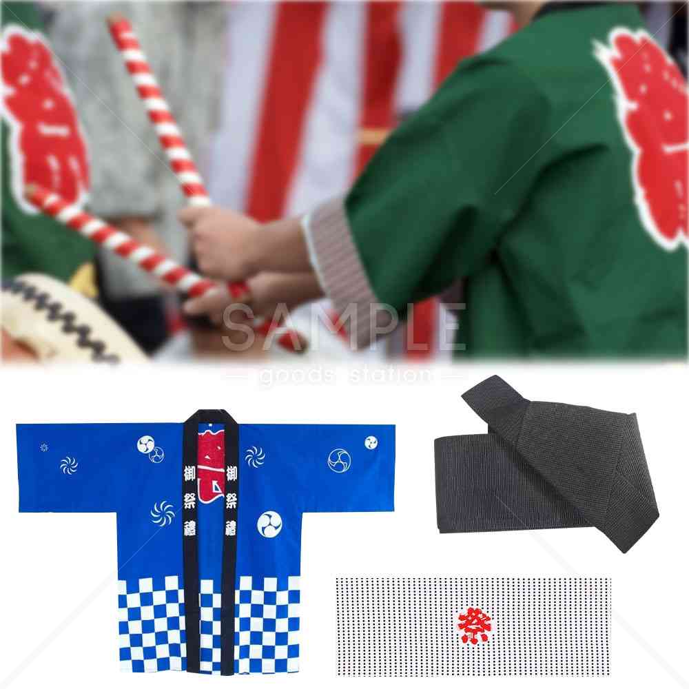 法被 手ぬぐい 帯 3点セット お祭り イベント ポリエステル製 袖裏豆絞り柄 市松模様 吸汗速乾 夏祭り 町内会 自治会 神社 男女兼用 大人用 すぐに使える 学園祭 文化祭 出店衣装