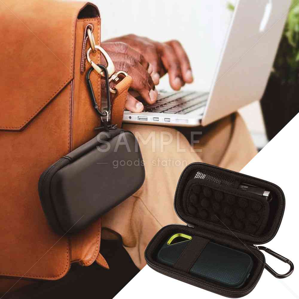 SanDisk SSD PortableExtremePRO対応 収納ケース カラビナ付き サンディスク 保護ケース メッシュポケット ケーブル収納 衝撃吸収 キズ防止 破損防止 ラウンドファスナータイプ 防水仕様 PU素材