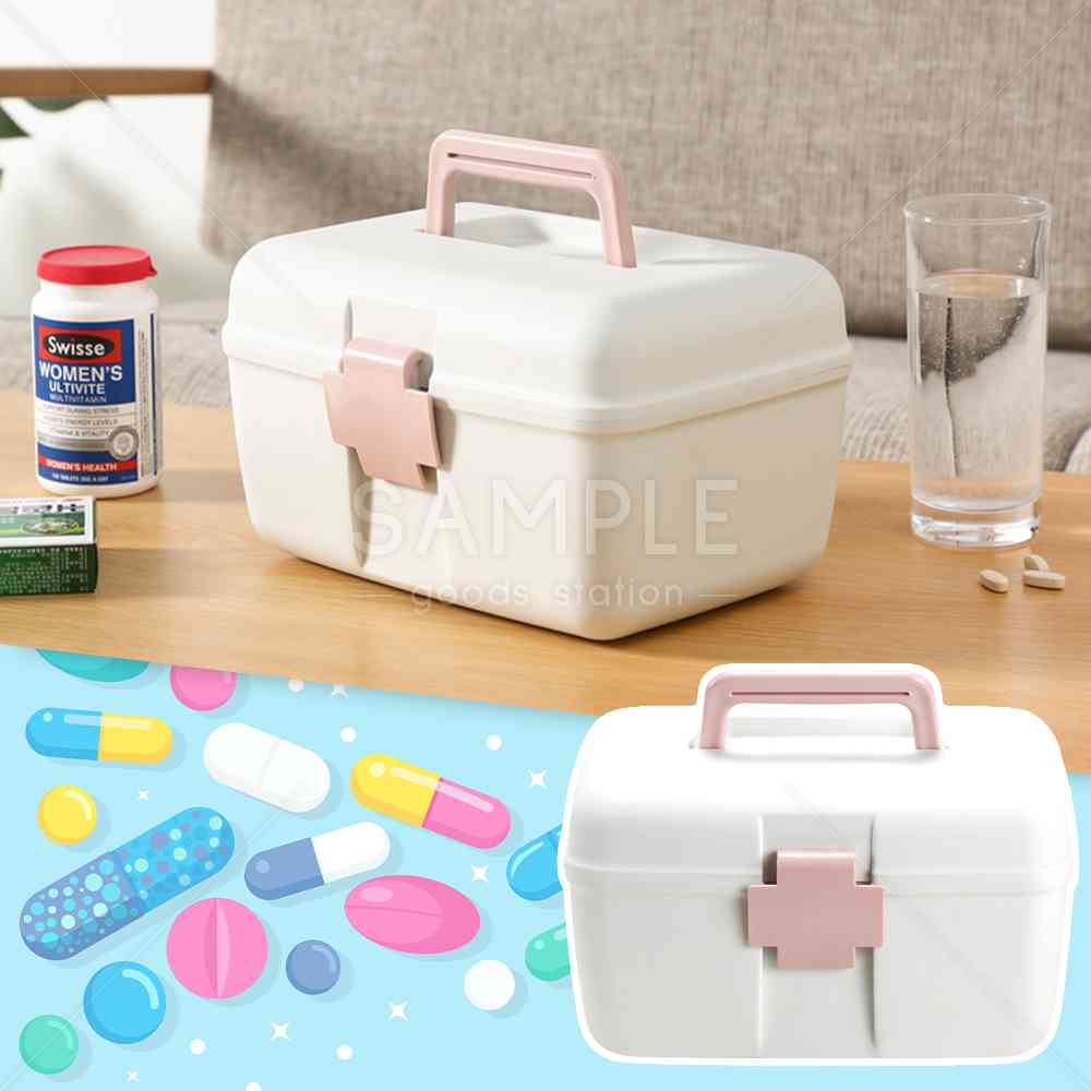 家庭用薬箱 救急セット 収納ボックス 2段式 仕切り 取り外せる 整理整頓 くすみカラー 小型 自宅 オフィス 持ち手付き 飛び出し防止ロック (ピンク)